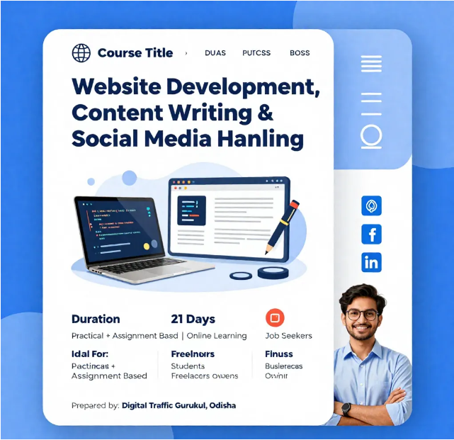 You will learn website creation, content writing, and social media handling with hands-on assignments and industry-ready guidance.